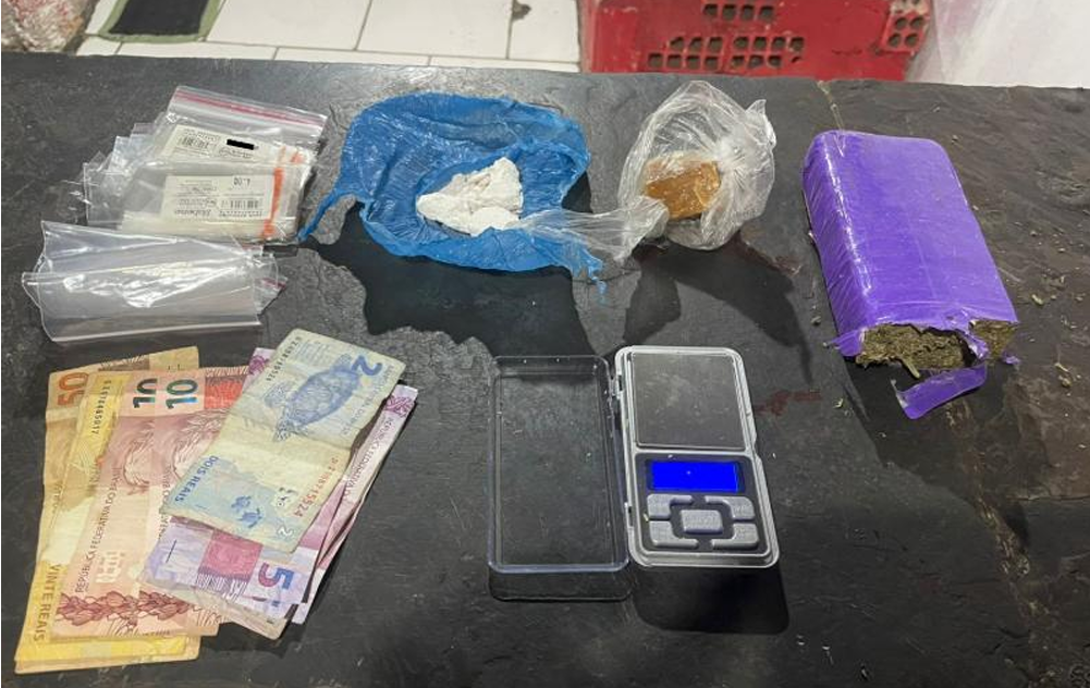 Durante a revista pessoal, os policiais encontraram um celular com o suspeito. Como a porta da casa estava aberta, a equipe realizou uma verificação no interior do imóvel, onde descobriu uma bolsa preta com um pacote roxo e uma balança de precisão.