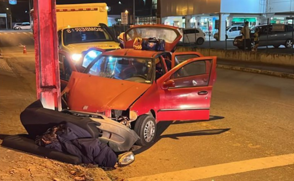 O impacto destruiu parte da frente do carro e comprometeu a estrutura da base do poste. Equipes da Polícia Militar e dos Bombeiros Voluntários foram acionadas para atender a ocorrência.