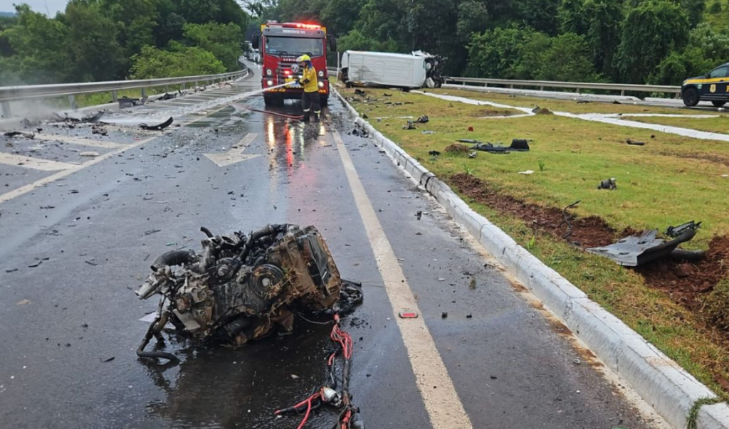 De acordo com informações preliminares, a van seguia no sentido Chapecó–Pinhalzinho quando, por razões ainda apuradas, invadiu o canteiro central do trevo e acabou atingindo de frente a carreta que vinha na direção oposta. O impacto da batida foi tão intenso que o motor do veículo utilitário se desprendeu e foi lançado a aproximadamente 50 metros do local da colisão.