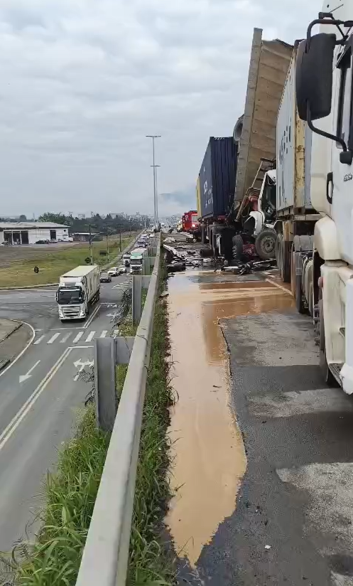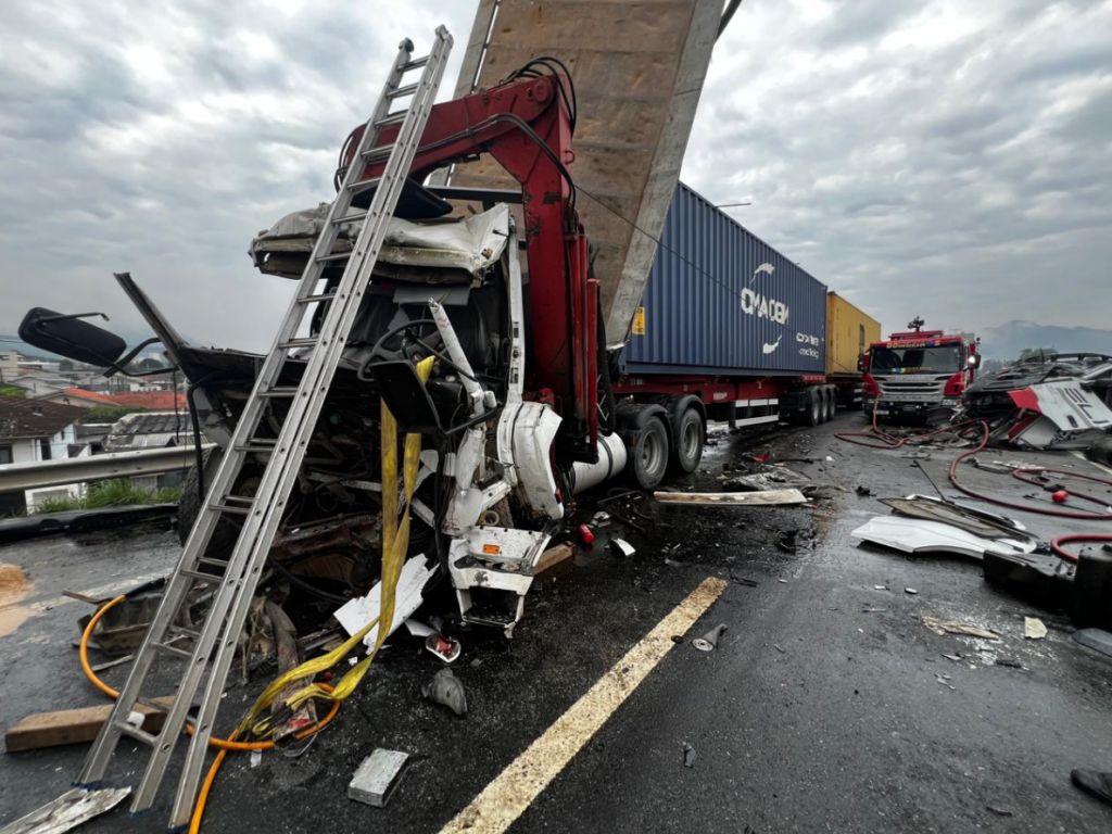 Na manhã desta terça-feira (16), por volta das 7h, um grave engavetamento envolvendo três caminhões e um automóvel paralisou o trânsito e mobilizou diversas equipes de resgate na BR-470, em Indaial.