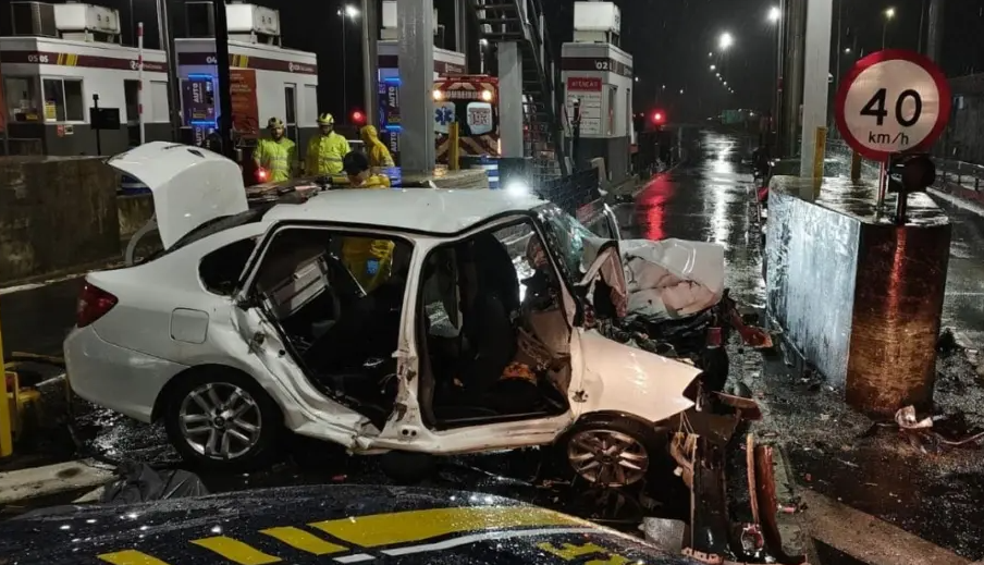Uma mulher de 44 anos morreu na noite de quinta-feira (23) depois que o carro em que ela viajava bateu com força contra a mureta de proteção entre as cabines de pedágio da BR-101, em São João do Sul, no Sul de Santa Catarina. O impacto foi fatal: a vítima, que ocupava o banco traseiro, não resistiu e morreu ainda no local do acidente.