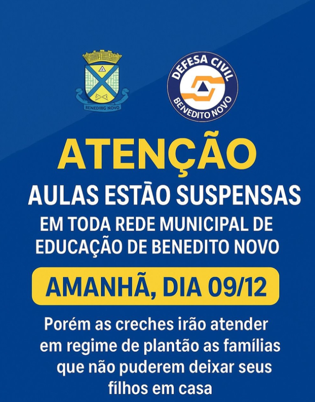 A Prefeitura de Benedito Novo, por meio da Secretaria Municipal de Educação, anunciou a suspensão total das aulas da rede pública nesta terça-feira, 9 de dezembro, após a emissão de alerta vermelho para tempestades na região do Vale Europeu. A decisão contempla tanto a Educação Infantil (CEIs) quanto o Ensino Fundamental, e segue as orientações oficiais repassadas pela Secretaria Estadual de Educação e pela Defesa Civil de Santa Catarina.