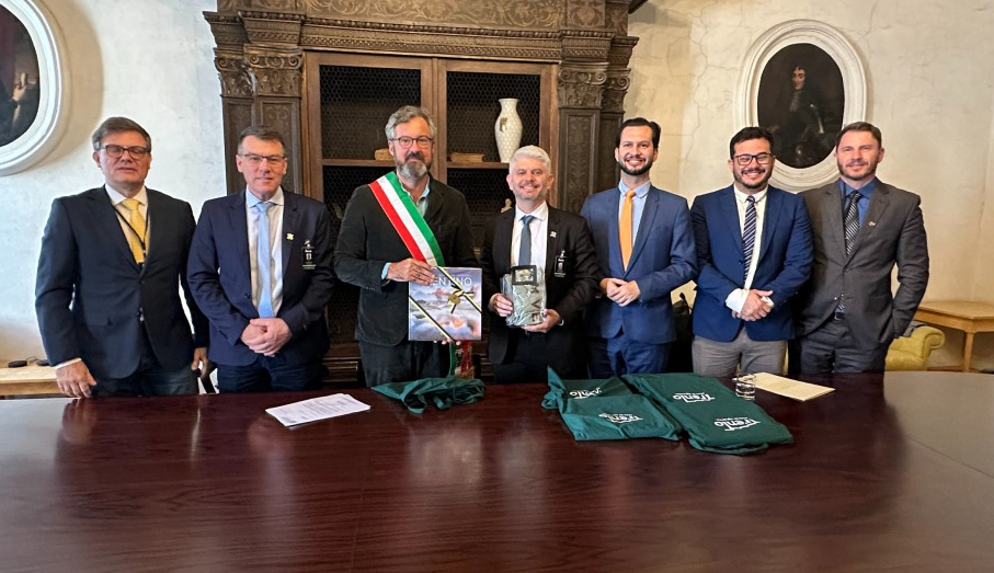 Prefeito Egidio Ferrari formalizou pedido de Pacto de Amizade em missão oficial; se aprovado, Blumenau pode ser a primeira cidade brasileira a firmar parceria com o município italiano.