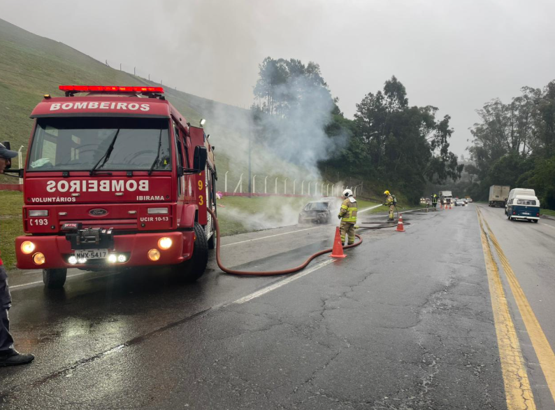 Um carro foi consumido pelas chamas no final da tarde desta segunda-feira (8), na BR-470, em Ibirama. O incêndio aconteceu por volta das 17h15, no km 123,5 da rodovia, próximo ao bairro Serra São Miguel.