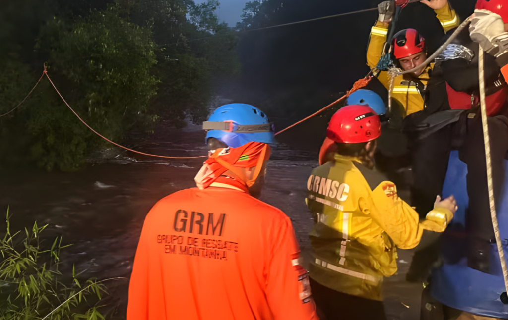 Para garantir a travessia em segurança, os bombeiros instalaram um cabo de aço próximo ao rio e montaram um sistema de “vai e vem” para transportar os participantes. A operação também contou com o uso de lanternas e torre de iluminação, já que o resgate se estendeu até o início da noite.