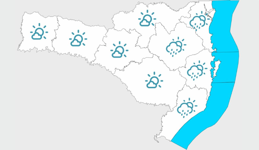 • Máximas: até 30°C no Oeste; entre 24°C e 27°C no Vale do Itajaí e Litoral Norte; e de 20°C a 25°C nas outras áreas