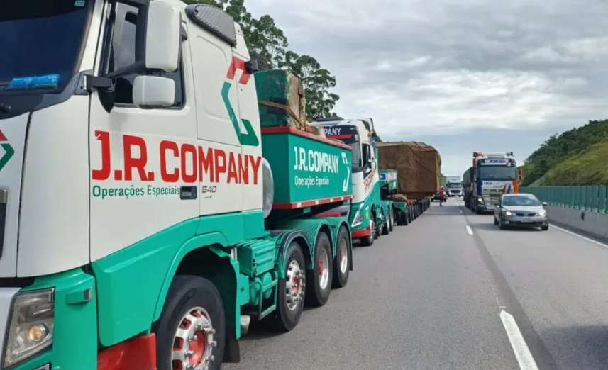 Um comboio de caminhões com carga superdimensionada provoca lentidão e filas ao longo da BR-101, em Santa Catarina, nesta quarta-feira (4). Os veículos transportam um gerador elétrico de grandes proporções e avançam em baixa velocidade pela rodovia, considerada a mais movimentada do estado.