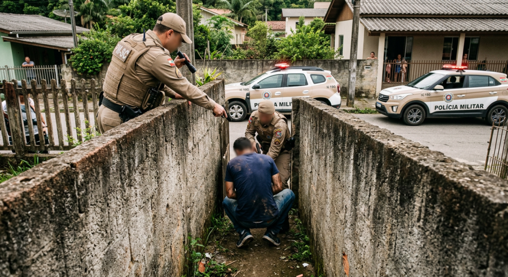 Uma fuga frustrada marcou o cumprimento de um mandado de prisão preventiva na manhã desta quarta-feira (15/04), por volta das 10h42, no bairro Ribeirão das Pedras, em Indaial. O alvo da operação era um homem de 38 anos, investigado por furto qualificado e com ordem de prisão expedida pela Vara Criminal da Comarca de Indaial.