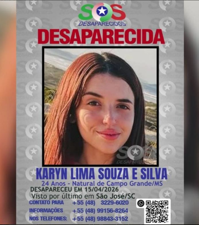 A secretária Karyn Lima Souza e Silva, de 24 anos, está desaparecida desde a manhã da última quarta-feira, após sair do trabalho na região da Grande Florianópolis. Ela foi vista pela última vez por volta das 9h, ao deixar a escola onde atuava, no bairro Praia Comprida, em São José.