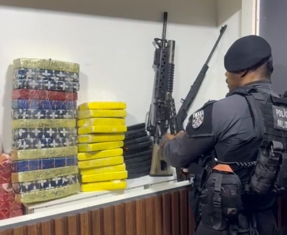 No local, os policiais localizaram 91 quilos de drogas, sendo 20 quilos de cocaína e 71 quilos de maconha. Além dos entorpecentes, foram apreendidos quatro fuzis de calibres 5,56 e 7,62, entre eles um modelo com lançador de granada acoplado, e uma espingarda calibre .22.