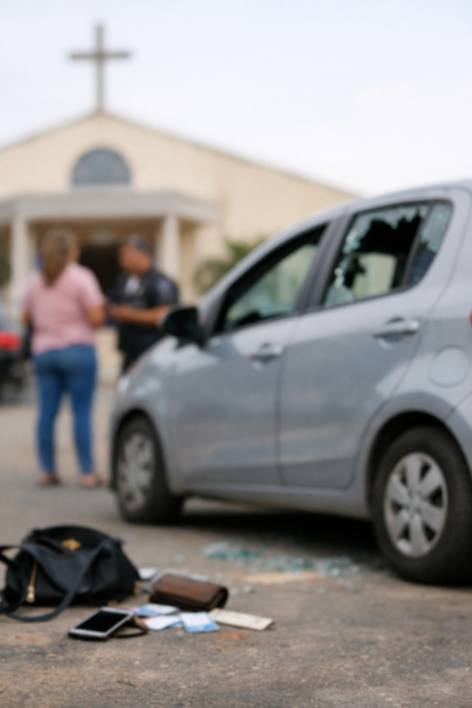 Do interior do automóvel, segundo a vítima, foram levados um telefone celular da marca Xiaomi, de cor rosa, além de documentos pessoais e cartões de crédito. A mulher contou ainda que, durante o culto, ouviu o disparo de um alarme veicular, mas não imaginou que se tratasse do seu carro, acreditando ser apenas mais um disparo acidental comum em estacionamentos cheios.